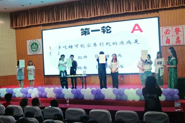 本次竞赛共分四个环节。食品知识,群英荟萃。蛋黄派队通过视频表明生产过程中食品安全形势严峻,并通过普及食品安全法律知识和事实举例表明食品安全的重要性。魔仙堡队从营养基础知识、食物与人群关系方面讲述,详细介绍了按照食品营养金字塔如何搭配膳食才能营养健康。各队间强强对决,各有千秋。