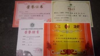 获得院食品安全月知识竞赛三等奖、院新年新诗会大赛三等奖、校篮球赛第八名、南校区乒乓球十院联赛第二名 、山东省模拟政协提案一等奖及校新生大合唱一等奖等十多项荣誉。