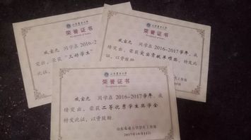 大一上学年智育成绩排名专业第一,平均绩点4.27;大一下学年综合英语成绩为专业最高93分;两学年总智育成绩排名专业第八,平均绩点3.97,其中大二上学期高数成绩为专业最高100分。历年获得校优秀学生二等奖学金、突出贡献单项奖,文体工作单项奖、洁翼流体企业奖学金及“三好学生”荣誉称号。
