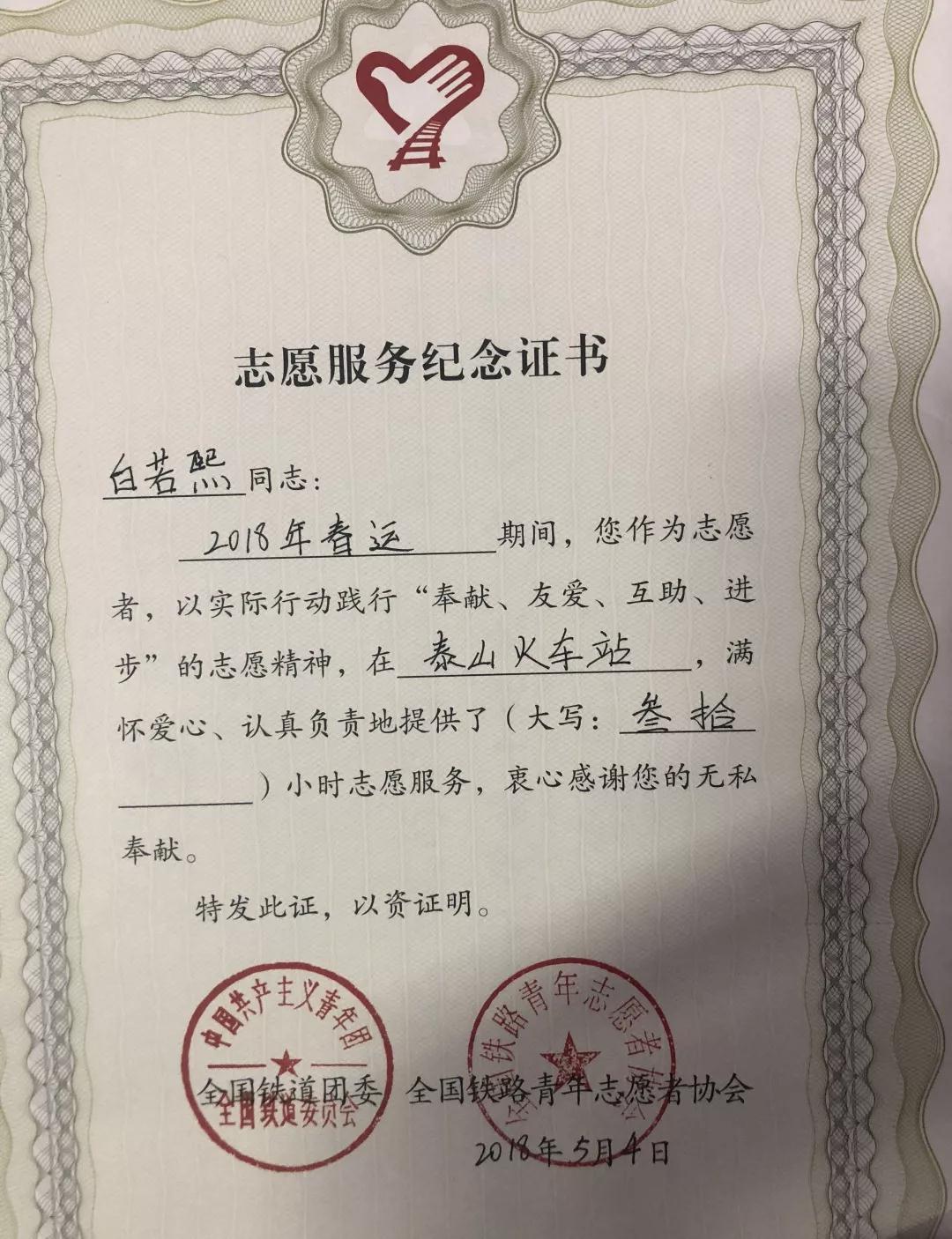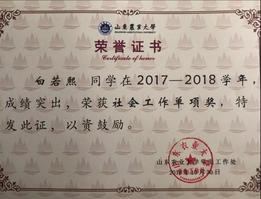积极加入社会实践团队,完成暑假三下乡实践活动,团队荣获“校级优秀社会实践团队”称号;寒假成为春运志愿者,在“泰山站”进行志愿服务,为春运人员提供温暖帮助。
