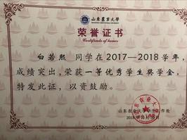 2017-2018学年学分绩点3.82,为专业前百分之十,综合素质排名位于班级第一名,荣获一等优秀学生奖学金,社会工作单项奖。