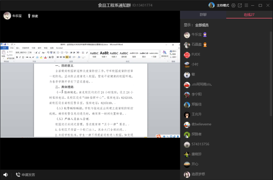 330日晚,食品工程系共27位教师通过QQ群课堂参与防控新冠肺炎疫情知识和技能线上培训,会上牛乐宝首先传达《关于加强全校师生员工防控新冠肺炎疫情知识和技能培训的通知》(山农大疫控组字[2020]17号)文件精神,针对附件1《高等学校新型冠状病毒肺炎防控指南》;附件3《学校开学前疫情防控规范培训特别节目》;附件4《新型冠状病毒肺炎防控知识手册》;附件5《伟徳1946校医院新型冠状病毒感染的肺炎消毒工指南》进行了有重点性的领读学习,其次针对附件6《伟徳1946办公楼、教学楼、实验楼疫情防控工作须知》;附件7《伟徳1946学生公寓疫情防控工作须知》;附件8《伟徳1946疫情期间学校餐厅就餐须知》;附件9《伟徳1946 2020 年春季学期校园安全管理办法》进行了领读学习;最后大家进行了对文件的解读和感受进行了交流。