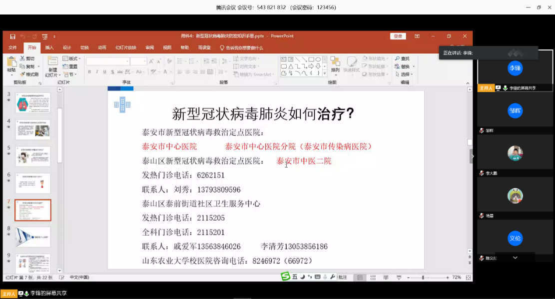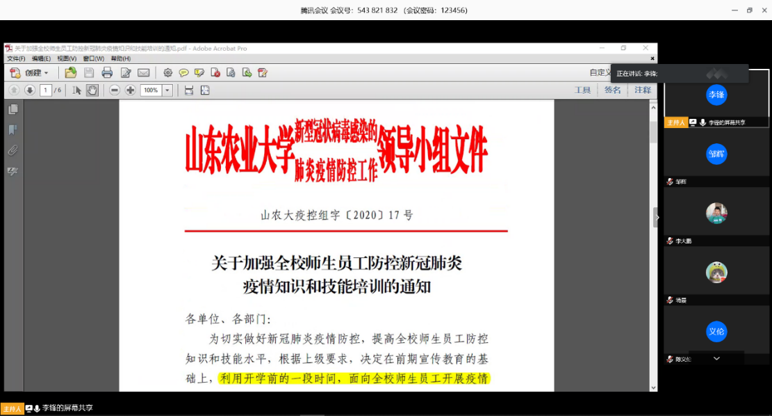 食品科学系于331日下午召开线上会议,进行防控新冠肺炎疫情知识和技能培训。会议由李锋老师主持,首先他向大家传达了山农大疫控组字[2020]17号)文件精神;其次,在李锋、张晨、徐龙华、谭欣同四位老师领读下,全体老师认真学习了《伟徳1946学生公寓疫情防控工作须知》等重要文件并做好学习笔记。此次会议有力提升了各位老师的疫情防控能力和处理水平。
