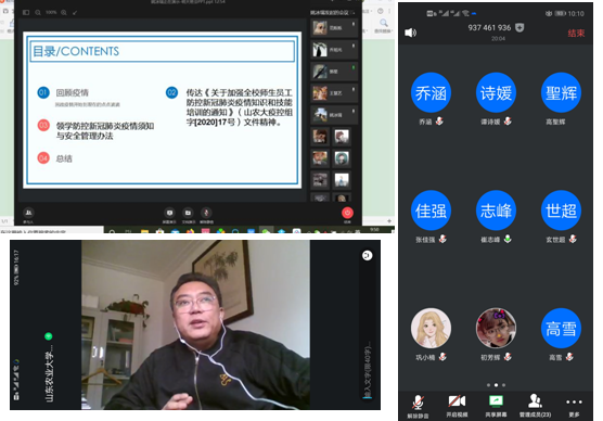 二是组织全体班主任和研究生导师研讨线上培训流程。330日下午,在线上培训会中,传达了《关于加强全校师生员工防控新冠肺炎疫情知识和技能培训的通知》(山农大疫控组字[2020]17号)文件精神,对《高等学校新型冠状病毒肺炎防控指南》《学校开学前疫情防控规范培训特别节目》《学校开学前疫情防控规范培训特别节目》《伟徳1946校医院新型冠状病毒感染的肺炎消毒工指南》等四个文件进行学习,同时对《伟徳1946办公楼、教学楼、实验楼疫情防控工作须知》《伟徳1946学生公寓疫情防控工作须知》《伟徳1946疫情期间学校餐厅就餐须知》《伟徳1946 2020 年春季学期校园安全管理办法》进行了逐字逐句领学。