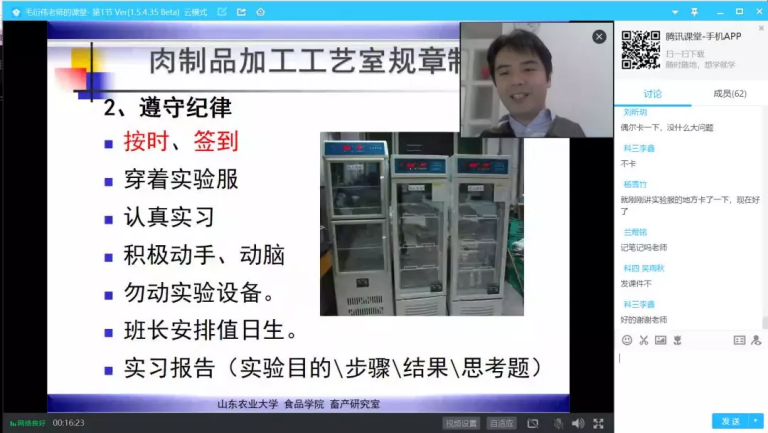 第一节课是石晶盈老师的《食品化学》,老师讲解了第一章绪论和第二章水分的部分内容,并且留了课后思考题。整个过程中网络比想象中的好,基本没有卡顿和延迟,并且还可以在线编辑信息与老师实时互动。即使是改变了教学方式,但老师的讲解比较透彻,就像一下子回到了教室一样。这其中凝聚着老师背后的辛勤付出,在这场没有硝烟的战役中,老师同样也是一道道美丽的风景线。