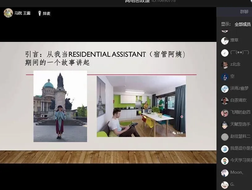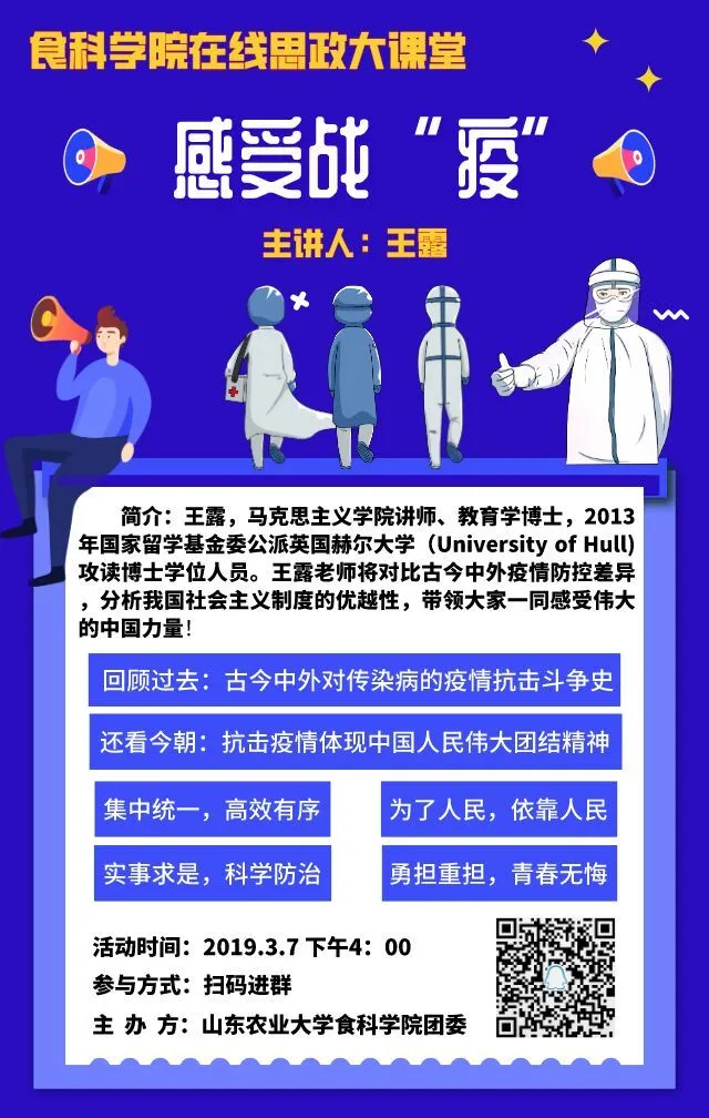 这堂生动别致的思政课以QQ群课堂直播的方式进行,王露老师结合在英国求学的亲身经历,讲述了古今中外抗击传染病疫情的历史,对比了各国疫情防控的差异,分析了我国社会主义制度的优越性,最终通过“集中统一,高效有序”、“为了人民,依靠人民”、“实事求是,科学防治”、“勇担重担,青春无悔”四个方面集中展示了战“疫”中的伟大中国。