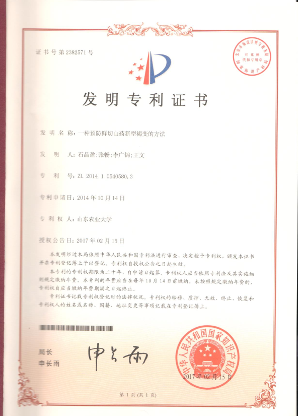 3 | Effects of postharvest curing treatment on flesh colour and phenolic metabolism in fresh-cut potato products | Food Chemistry, 2015, 169: 246-254 | SCI:9.231 | 王庆国 |