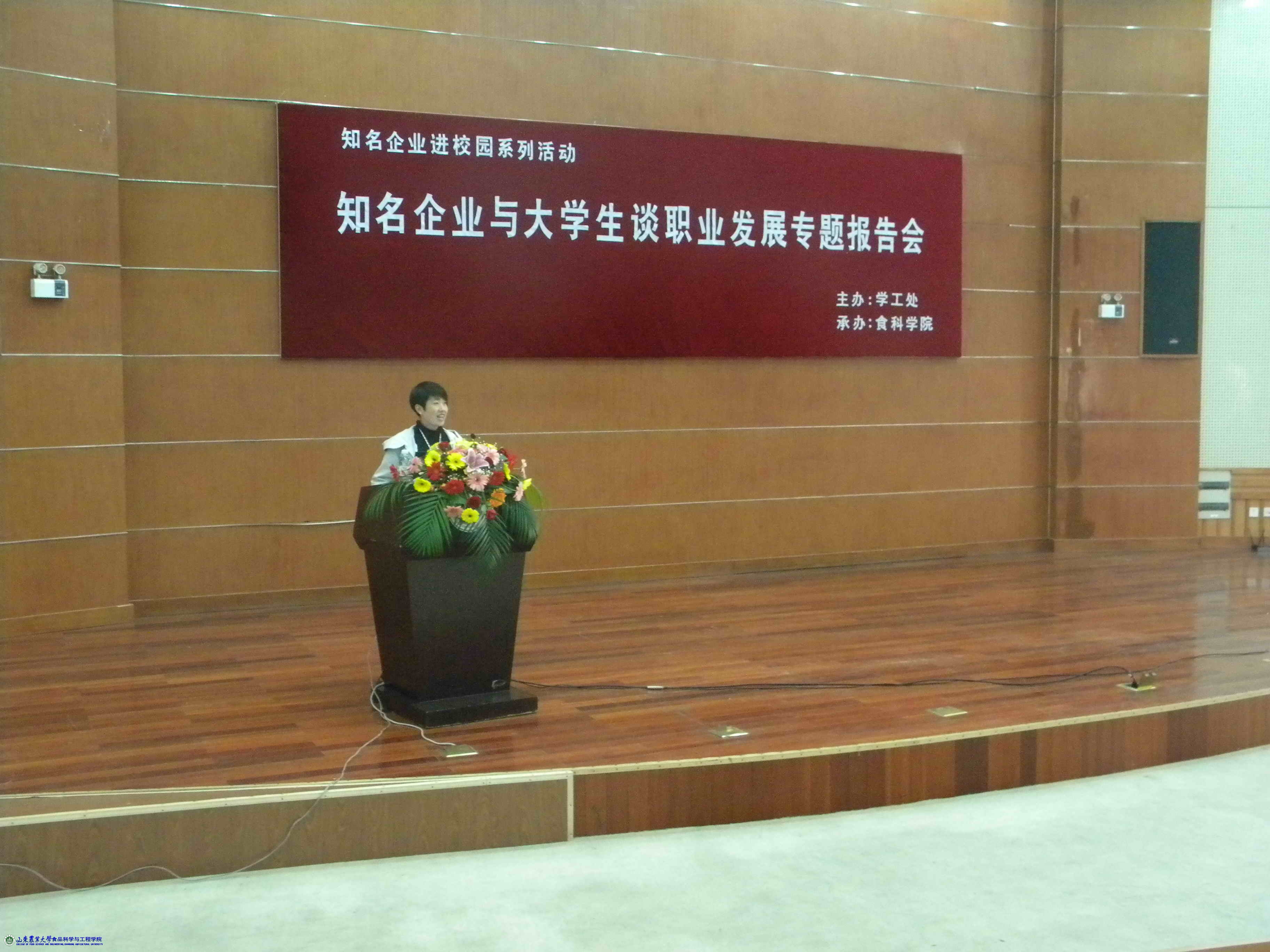 山东六合集团有限公司肉食事业部副总经理谢荣山先生,山东六合集团有限公司肉食事业部人力资源总监助理张玉女士;食科学院副院长罗欣教授,学院学生工作负责人、学院团委负责人,500多名食科学院高年级同学和部分兄弟学院的同学一起参加本次专题报告会。
