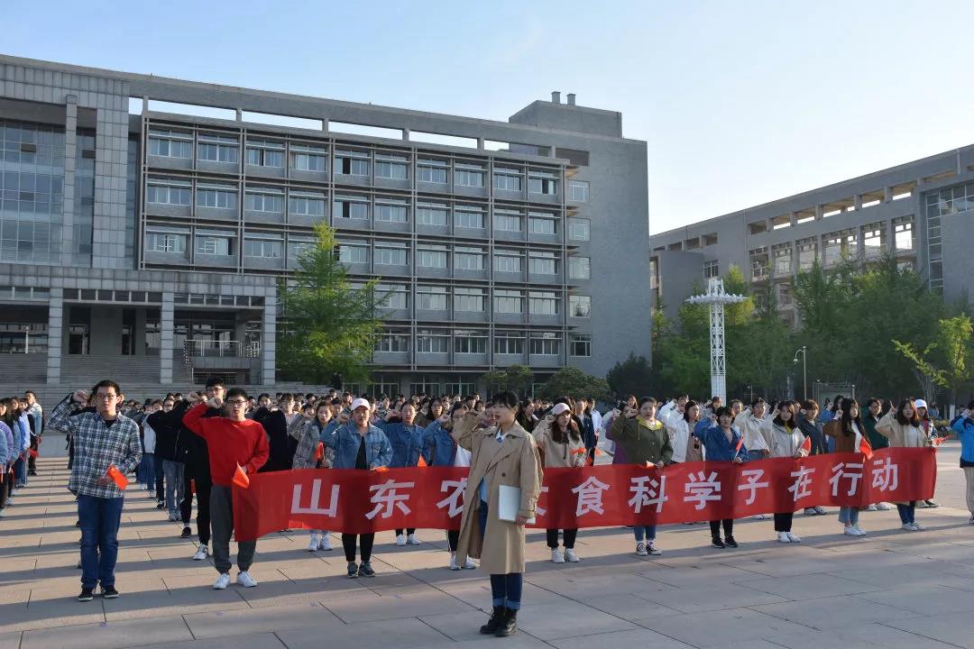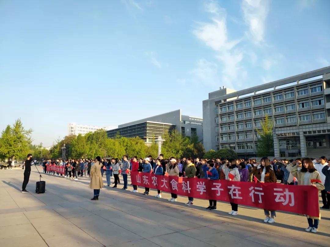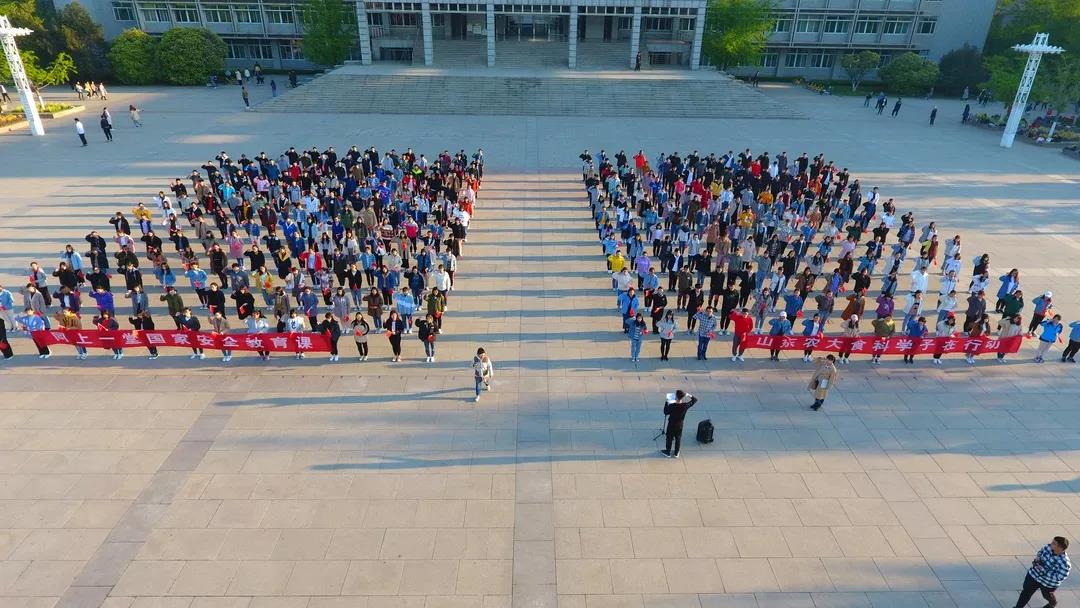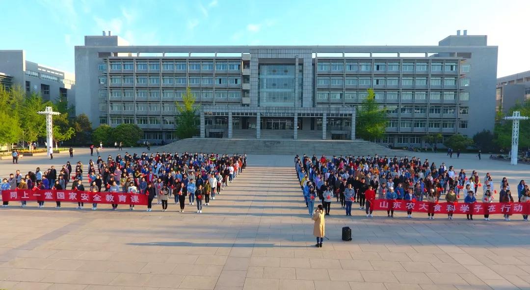宽阔的广场变成国旗的海洋,同学们挥舞手中的小国旗,共同举起写有“同上一堂国家安全教育课,山东农大食科学子在行动”标语的横幅,表达为维护国家安全而努力学习,争做社会主义合格建设者和可靠接班人的决心。