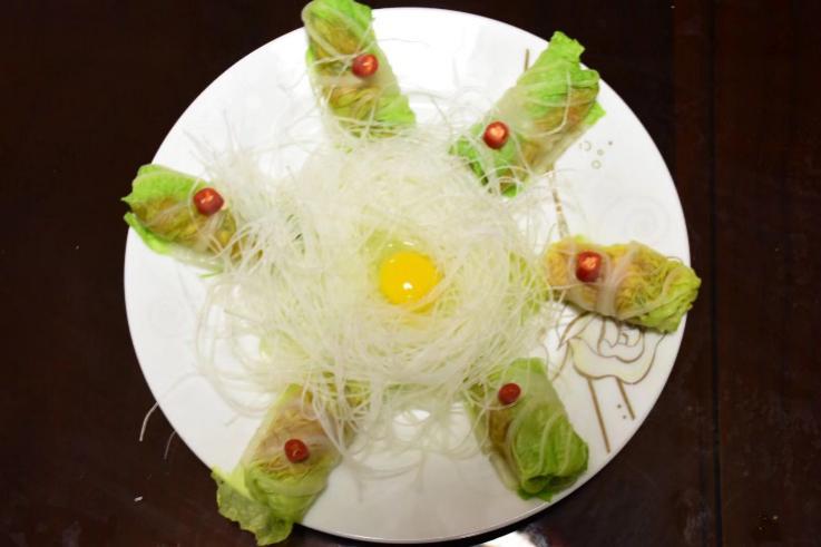 1、灯笼茄子          2、百财聚来(白菜卷肉)             3、百鸟归巢