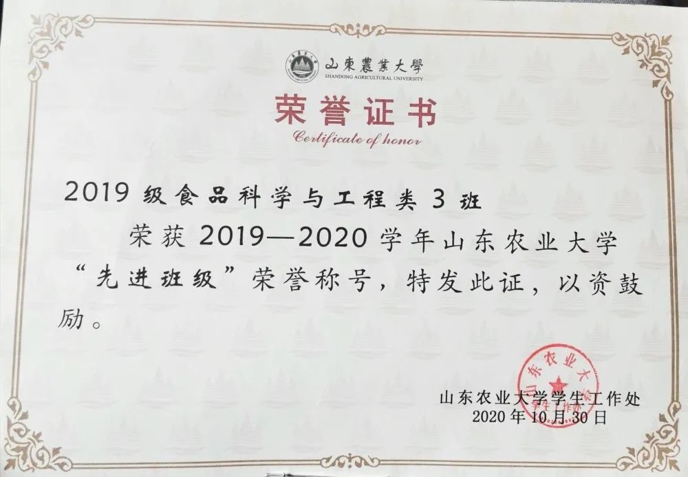 2020年10月荣获伟徳1946“先进班级”荣誉称号