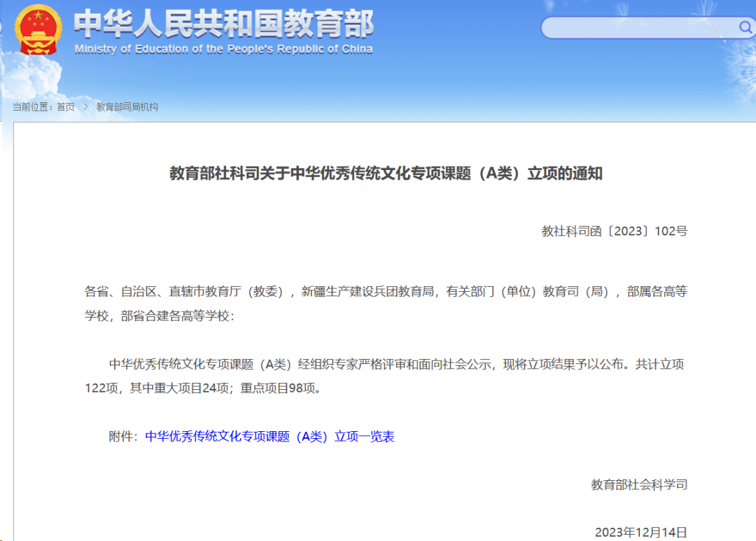 近日,教育部社会科学司发布了《教育部社科司关于中华优秀传统文化专项课题(A类)立项的通知》。我校获立2项,其中,我院吴澎教授获重大项目1项。这是我校首次获立教育部重大科研项目,且为单项立项经费金额最高项目。